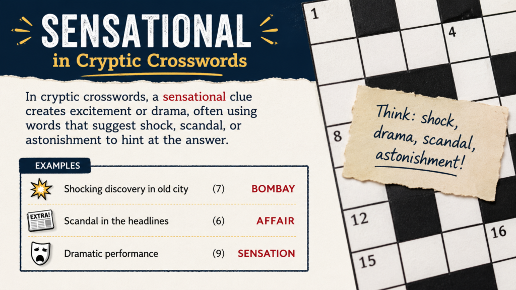 In cryptic crosswords, the sensational crossword clue can function as more than a simple definition. It may act as an indicator suggesting exaggeration, distortion, or emotional emphasis within the wordplay. In these cases, solvers must break the clue into its grammatical components rather than focusing solely on surface meaning.